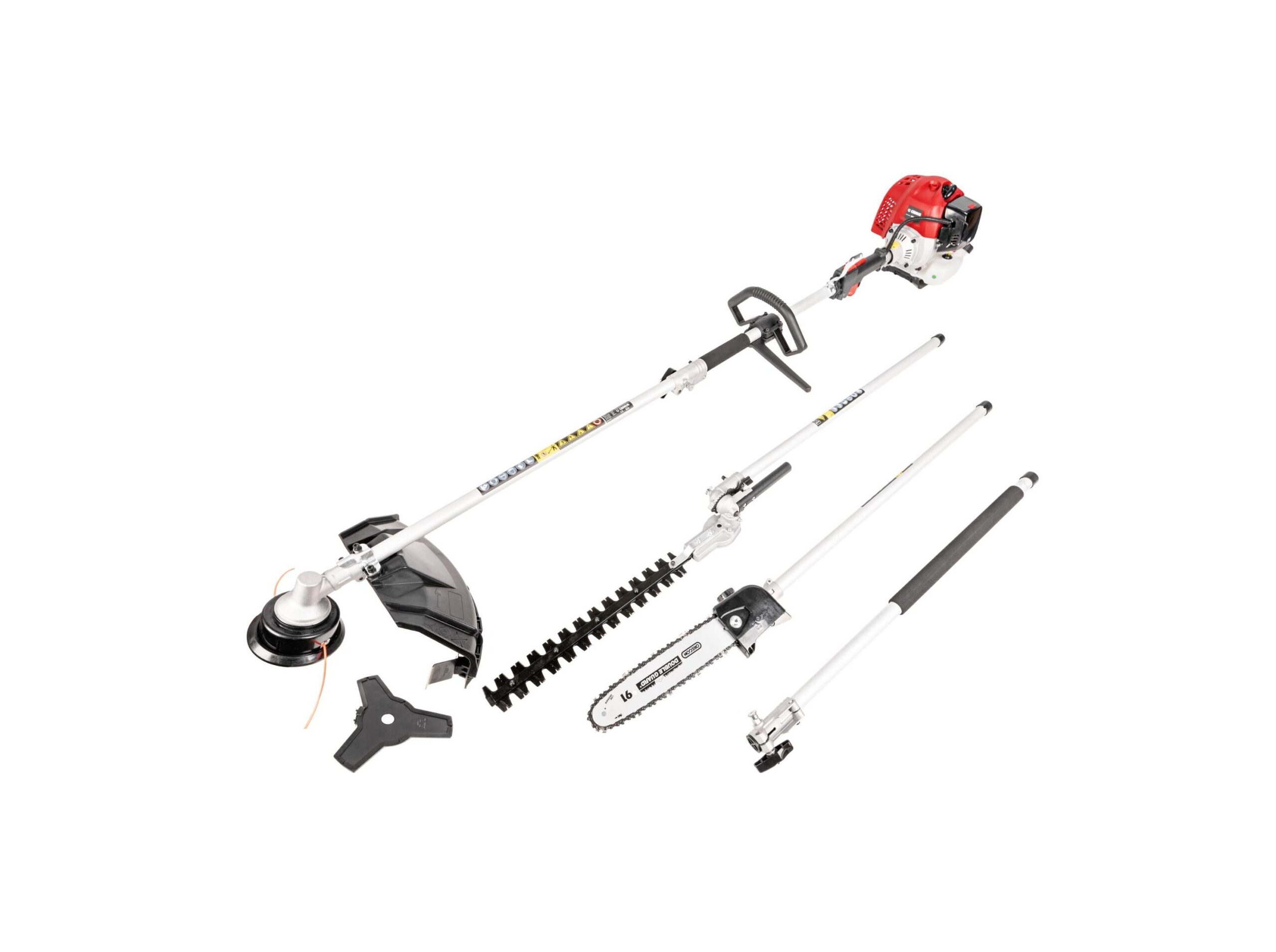 - Wyposażenie kosa spalinowa, półautomatyczna głowica żyłkowa, tarcza tnąca, pilarka na wysięgniku, nożyce do żywopłotu, przedłużka 1m, szelki